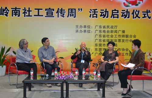 为深入贯彻落实中央18部委《关于加强社会工作专业人才队伍建设的意见》、《社会工作专业人才队伍建设中长期规划(2011-2020年)》,以及省委办公厅、省政府办公厅《关于加强社会工作人才队伍建设的实施意见》精神,进一步扩大社工影响,提升社工的社会知晓度、认同度,广东省民政厅联合广东电台新闻广播、广东省社会工作师联合会、广东省福利彩票发行中心、东莞市民政局于3月19日在东莞市举办第二届“岭南社工宣传周”活动启动仪式。
