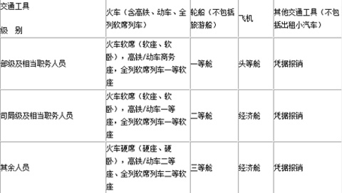 第七条出差人员应当按规定等级乘坐交通工具。乘坐交通工具的等级见下表: