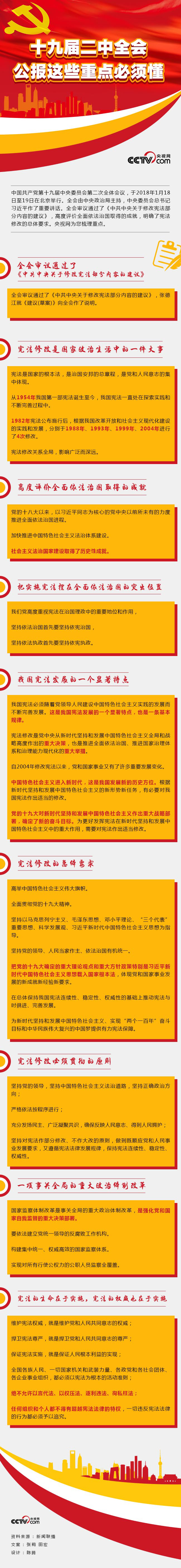 中国共产党第十九届中央委员会第二次全体会议,于2018年1月18日至19日在北京举行。全会由中央政治局主持,中央委员会总书记习近平作了重要讲话。全会审议通过了《中共中央关于修改宪法部分内容的建议》,高度评价全面依法治国取得的成就,明确了宪法修改的总体要求。